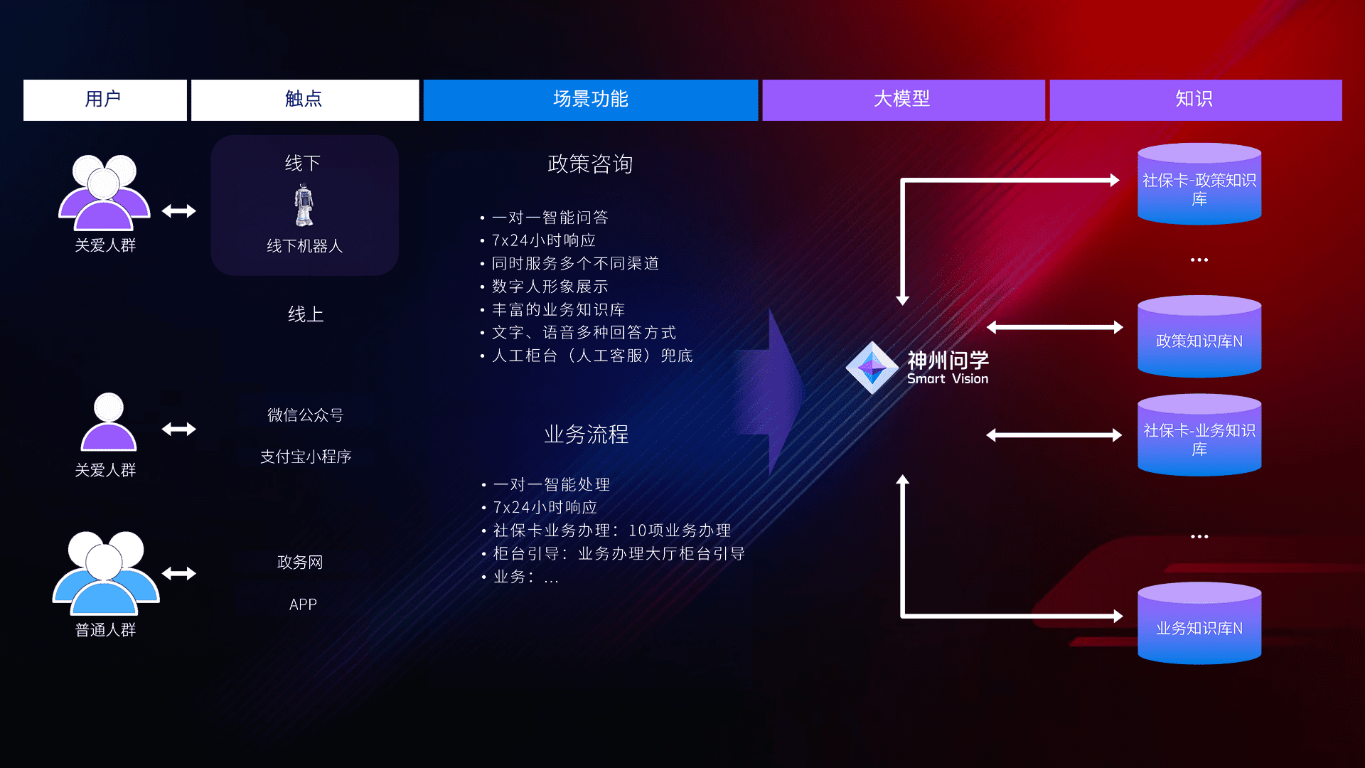 • 利用大语言模型+RAG技术,,,,支持多轮对话,,,,可识别多种同义词、、、近义词,,,精准理解关爱人群语义快速输出结果。。