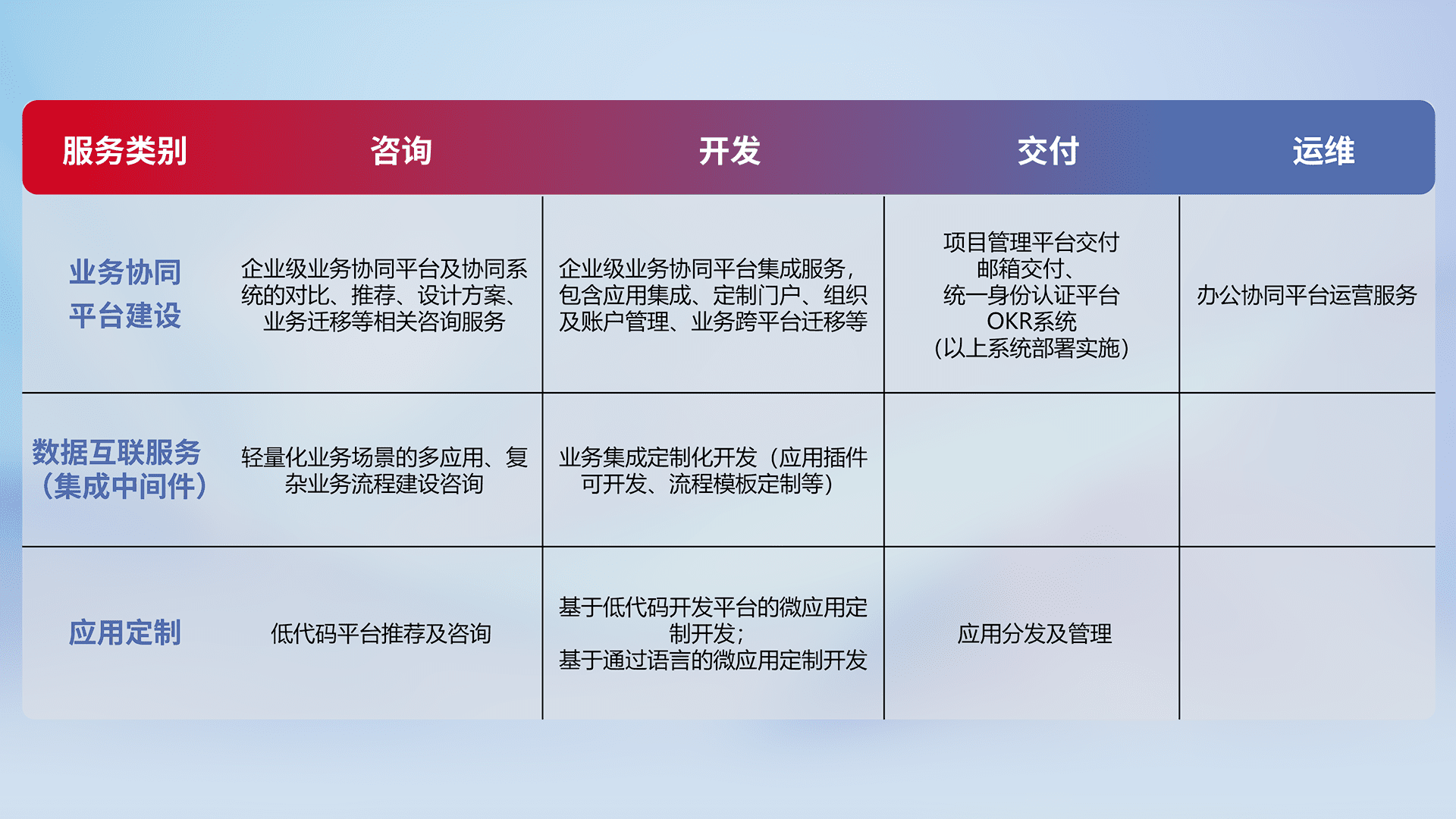针对钉钉、、、企微、、、IDaas等平台级产品提供产品的规划、、、方案、、、、交付、、、定制化开发等服务,,,实现如统一协同办公、、、智能客户服务、、、、混合会议管理、、、智能数据查询、、等业务场景,,实现数字化转型。。。。