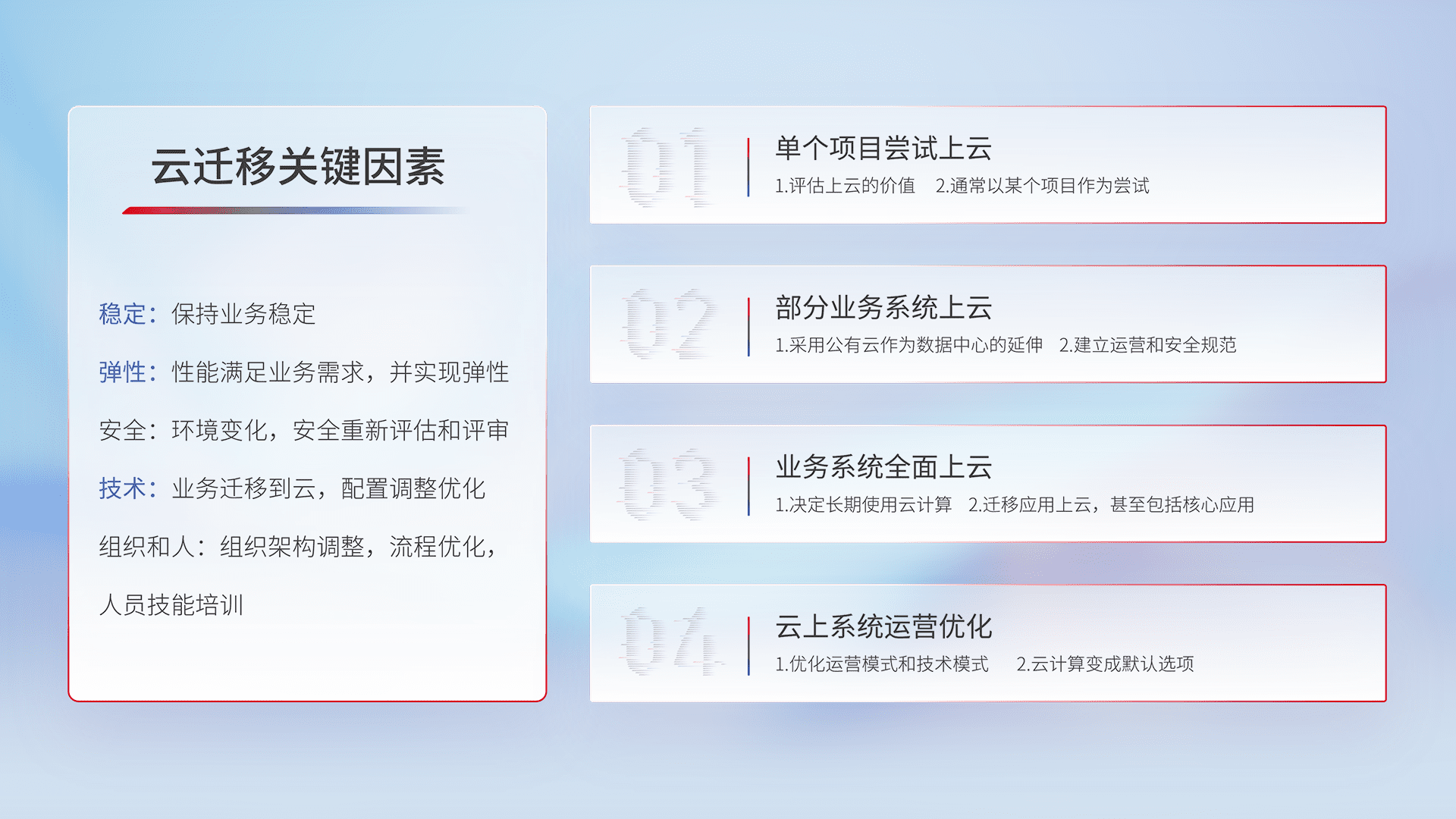 结合实际业务,,,从规划设计、、云平台选型、、、云原生改造、、、、数据迁移、、、、集成交付,,,,迁移全过程为客户识别最佳上云路径,,,,做好风险识别管理,,设计网络架构、、、身份权限、、、安全审计合规、、、操作审计、、、、日志审计、、监控告警策略、、、、多站点容灾设计等,,,对云上基础设施进行整体规划,,提升IT治理水平,,,,以满足弹性、、高可用、、、高性能的需求。。