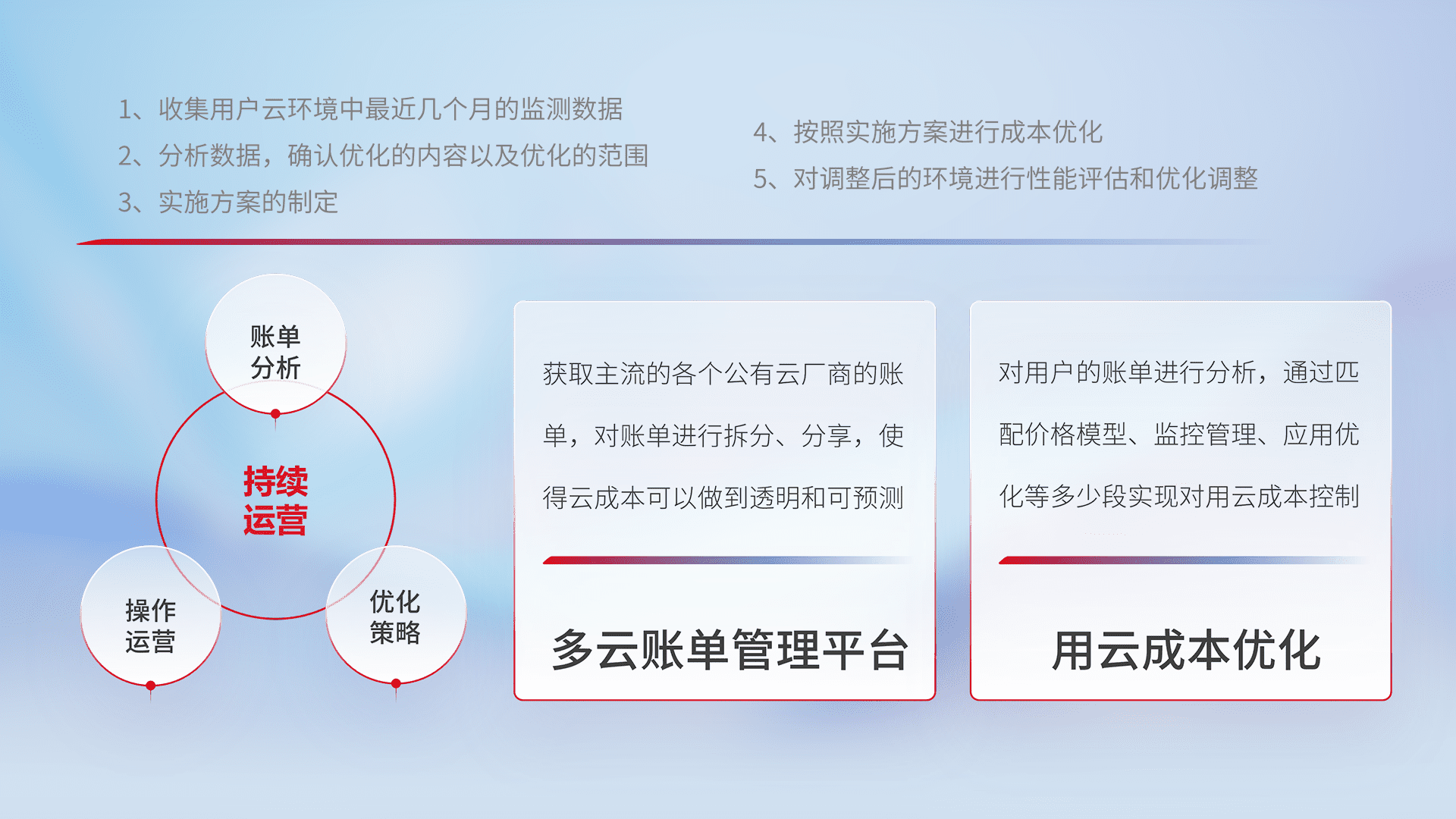 通过多云纳管,,以统一的资源数据模型把客户的云资源进行抽象和封装,,,进而实现对多云资源的统一操作,,,保障云资源管理的可靠性、、稳定性与可用性。。。。量身定制化运维内容,,,,配置、、开发运维、、补丁管理、、、备份、、监控、、、、认证和访问管理、、审计和日常巡检等,,保障在用云过程中的可靠度,,,稳定度以及高可用率。。。
